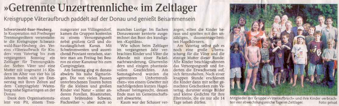 Schwarzwald-Baar-Heuberg. In Kooperation mit Freiburger Trennungsvätern veranstaltete die Kreisgruppe Schwarzwald-Baar-Heuberg des Vereins "Väteraufbruch für Kinder" vom Vatertag bis zum vergangenen Sonntag ein Zeltlager für Trennungskinder. Sieben Väter und eine Mutter mit insgesamt 16 Kindern im Alter von vier bis 16 Jahren trafen sich am Donnerstag mit ihren Zelten auf dem Campingplatz Warenburg nahe Sigmaringen an der Donau.