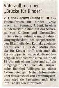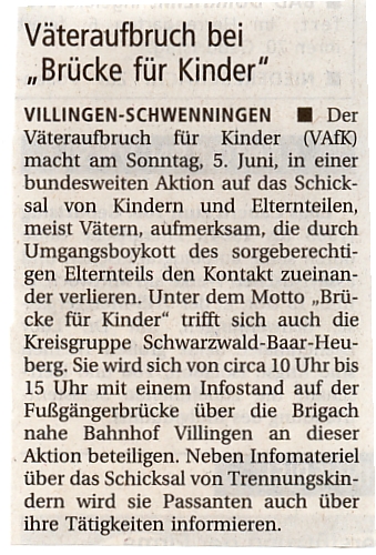 VILLINGEN-SCHWENNINGEN Der Väteraufbruch für Kinder (VAfK) macht am Sonntag, 5. Juni, in einer bundesweiten Aktion auf das Schicksal von Kindern und Elternteilen, meist Vätern, aufmerksam, die durch Umgangsboykott des sorgeberechtigen Elternteils den Kontakt zueinander verlieren. Unter dem Motto "Brücke für Kinder" trifft sich auch die Kreisgruppe Schwarzwald-Baar-Heuberg. Sie wird sich von circa 10 Uhr bis 15 Uhr mit einem Infostand auf der Fußgängerbrücke über die Brigach nahe Bahnhof Villingen an dieser Aktion beteiligen. Neben Infomaterial über das Schicksal von Trennungskindern wird sie Passanten auch über ihre Tätigkeiten informieren.