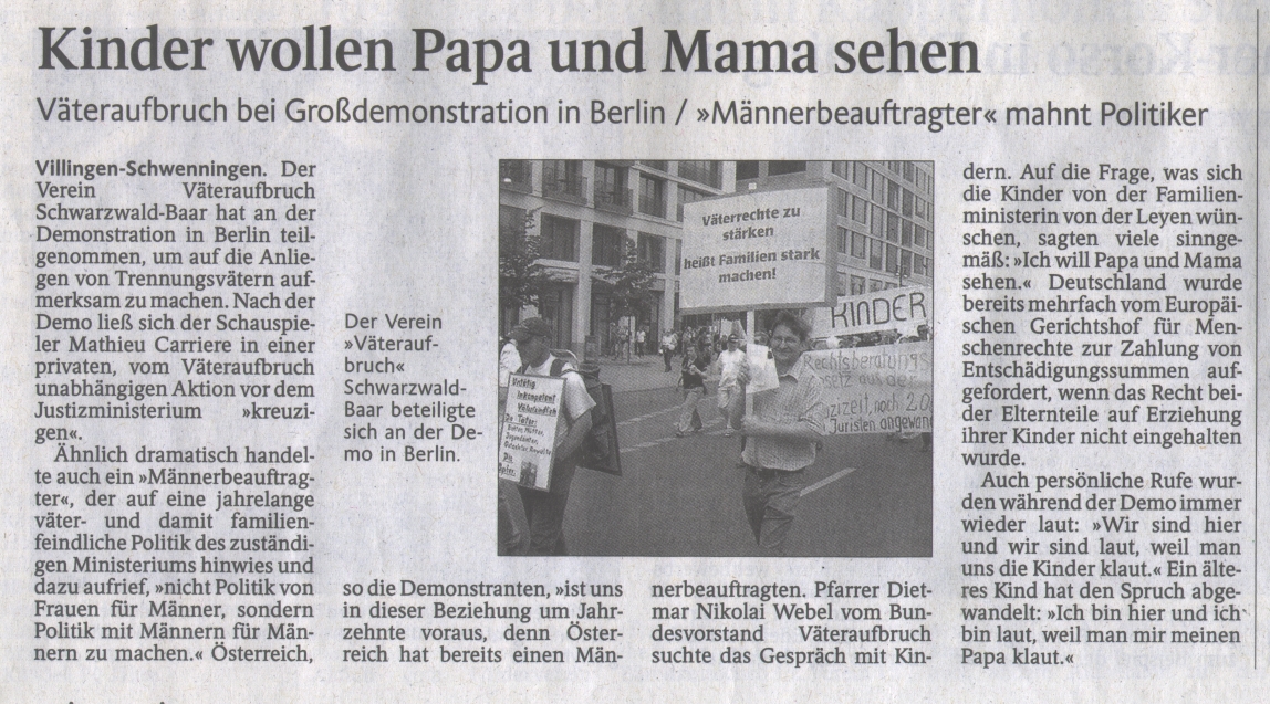 Ähnlich dramatisch handelte auch ein "Männerbeauftragter", der auf eine jahrelange väter- und damit familienfeindliche Politik des zuständigen Ministeriums hinwies und dazu aufrief, "nicht Politik von Frauen für Männer, sondern Politik mit Männern für Männern zu machen." Österreich, so die Demonstranten, "ist uns in dieser Beziehung um Jahrzehnte voraus, denn Österreich hat bereits einen Männerbeauftragten. Pfarrer Dietmar Nikolai Webel vom Bundesvorstand Väteraufbruch suchte das Gespräch mit Kindern. Auf die Frage, was sich die Kinder von der Familienministerin von der Leyen wünschen, sagten viele sinngemäß: "Ich will Papa und Mama sehen." Deutschland wurde bereits mehrfach vom Europäischen Gerichtshof für Menschenrechte zur Zahlung von Entschädigungssummen aufgefordert, wenn das Recht beider Elternteile auf Erziehung ihrer Kinder nicht eingehalten wurde.